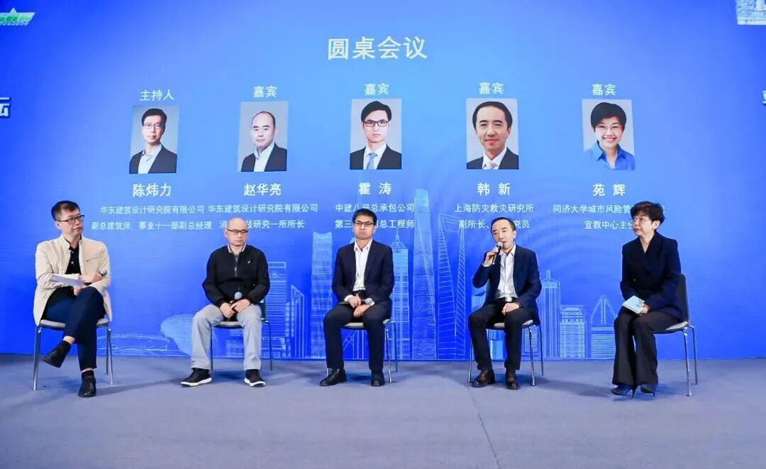 华东院专项设计中心消防科技研究一所所长赵华亮,中建八局总承包公司第三分公司副总工程师霍涛,上海防灾救灾研究所副所长、研究员韩新,同济大学城市风险管理研究院宣教中心主任苑辉等专家围绕“智能时代下的城市韧性建设”主题交流分享各自的专业思考和深刻见解。圆桌论坛由华东院副总建筑师、第十一建筑设计事业部副总经理陈炜力主持。