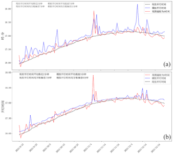 图 基于(a)回归统计预测辐射强度、(b)全波段辐射参数模型的傍晚路灯开启时间天气影响模型模拟开灯时间比较上海市的绿色照明政策和科研成果,不仅体现了对环境保护和能源节约的重视,也展示了科技创新在推动城市可持续发展中的重要作用。通过这些努力,上海市正逐步构建一个更加宜居、绿色、智慧的城市环境,为市民提供更高质量的生活空间。